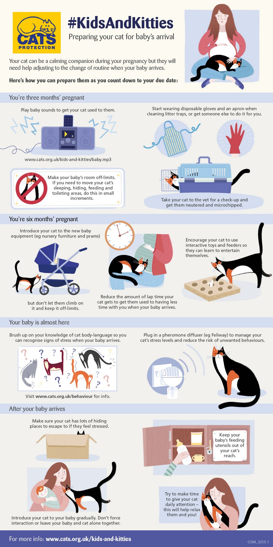 Cats love routine and one of the best ways to make introducing your cat to your baby go as smoothly as possible is to be proactive. We have lots of tips in our ‘Cats and your pregnancy’ guide to help you prepare for your cat for the baby, long before they arrive.