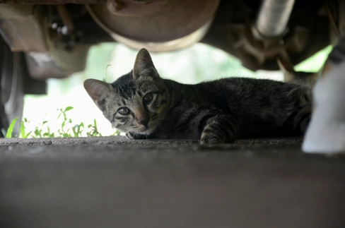 Cats love to hide, and sometimes this can include underneath parked cars. On a cold day, some cats have even been known to nestle themselves in a warm car engine in search of a cosy spot.