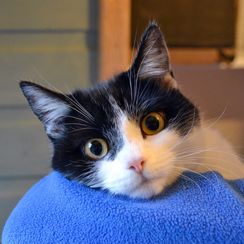 Black and white cat with green eyes close up on blue blanket looking at cameraLiverpool is the first area to benefit from Cats Protection’s Emergency Respite Cat Care initiative, which allows affected cat owners to temporarily hand over their cat to be looked after by dedicated staff at Warrington Adoption Centre.