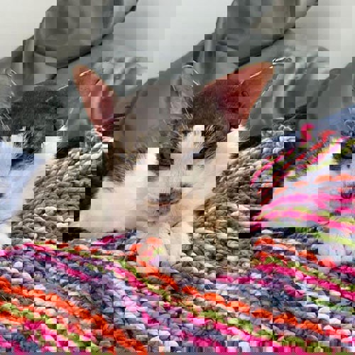 Spot, the cat, lying on multicoloured rugWhen Spot was admitted in to the care of the Lichfield & Tamworth Branch of Cats Protection, it became obvious that poor Spot was suffering.