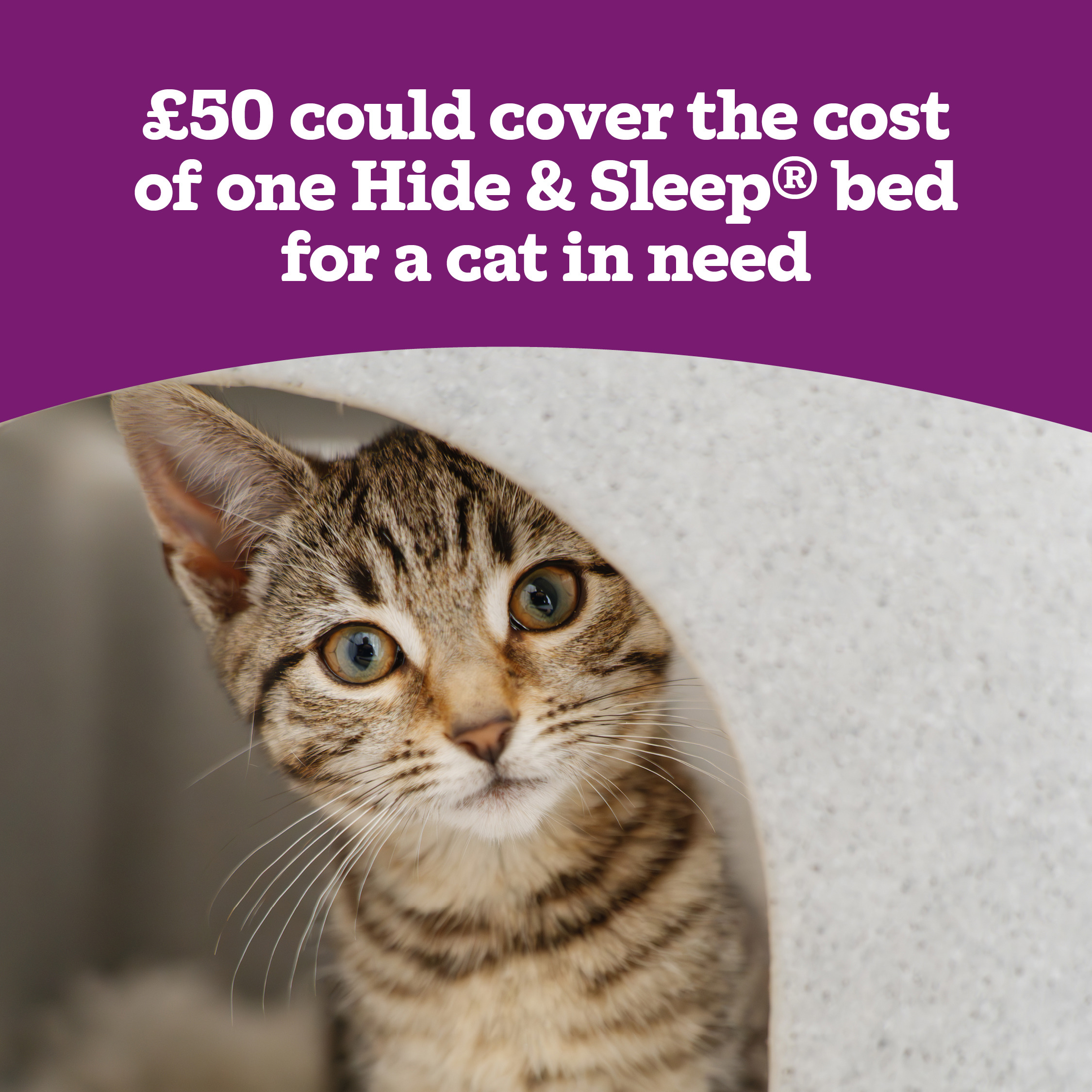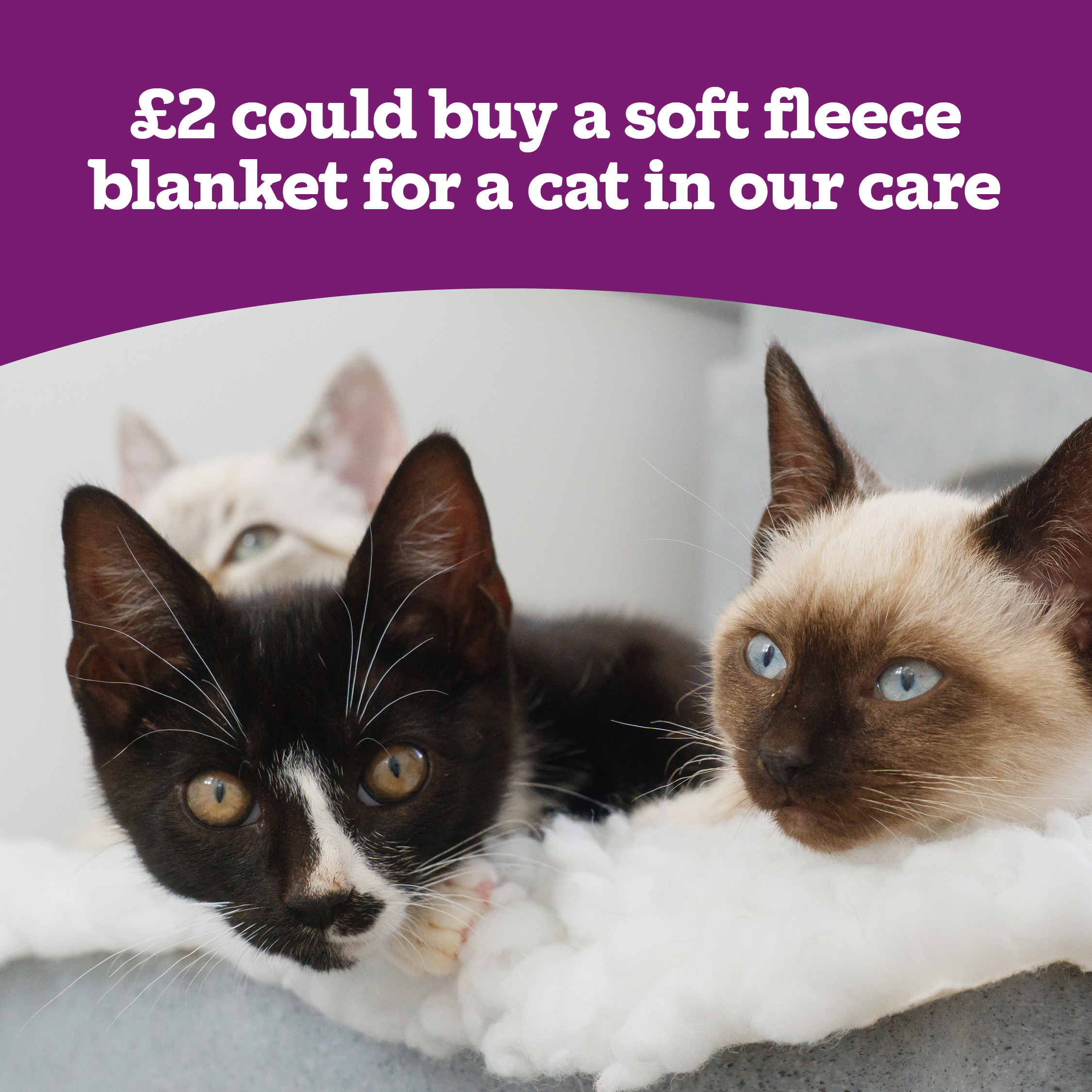 • £5.70 could provide a cat in our care with vet bedding to line their bed or Feline Fort, which will keep them warm and cosy