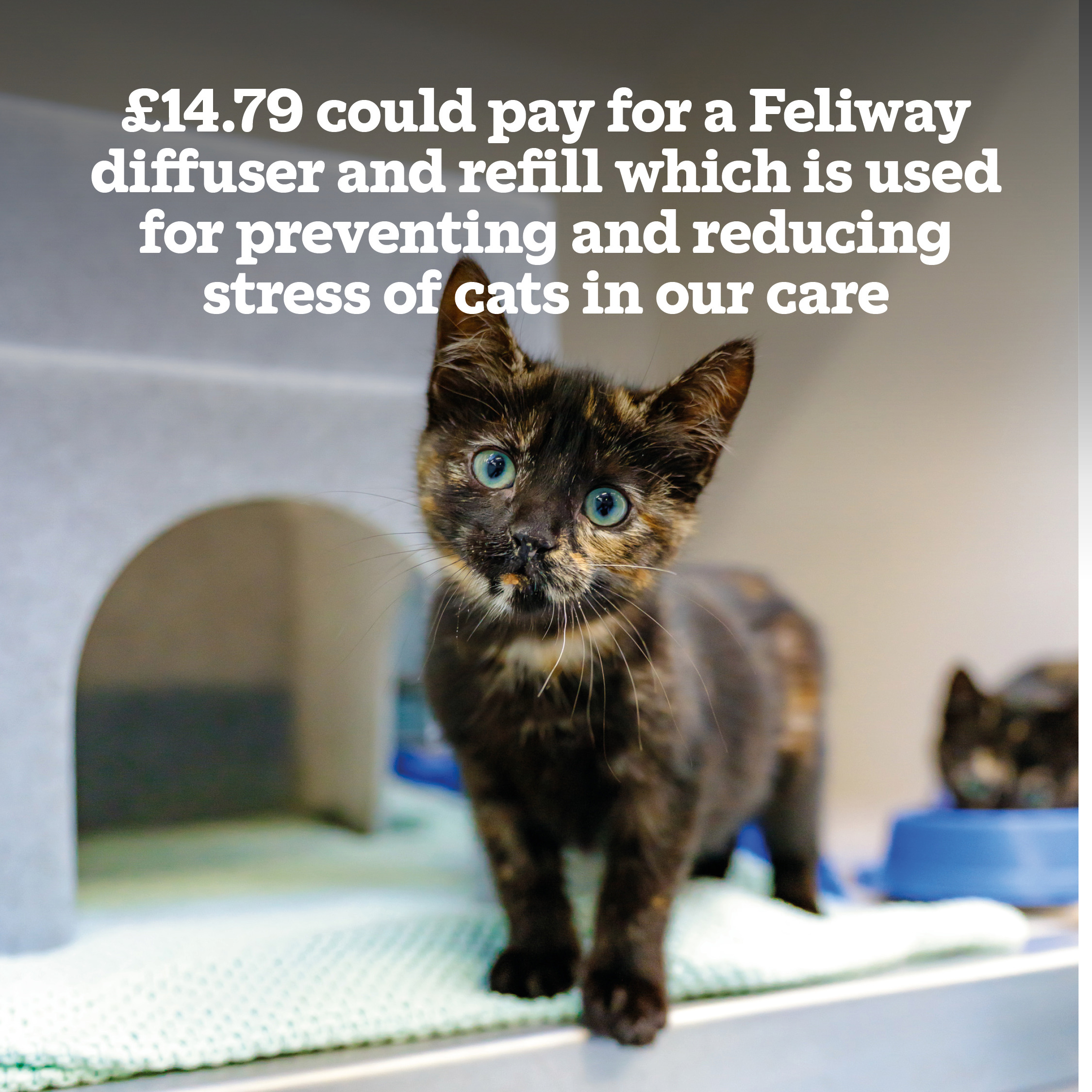 • £14.79 could pay for a Feliway diffuser and refill which is used for preventing and reducing stress of cats in our care